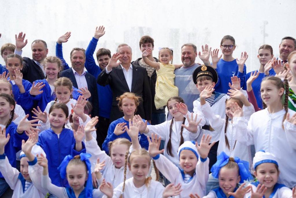 Санкт-Петербург, 29 мая 2025 года. Александр Беглов и Александр Бельский запустили новый светомузыкальный фонтан в Линейном парке на Васильевском острове.